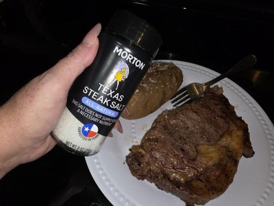 [This review was collected as part of a promotion.] Morton Texas Steak Salt is just what I needed to make my steakhouse baked potatoes at home it just the right size to cling to the potatoes and not melt away while cooking, but not too biggie some other salts I've found. I love how it comes in a sealed glass container to keep moisture out which makes it last longer and not clump together. When I run out I will be buying more.