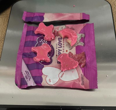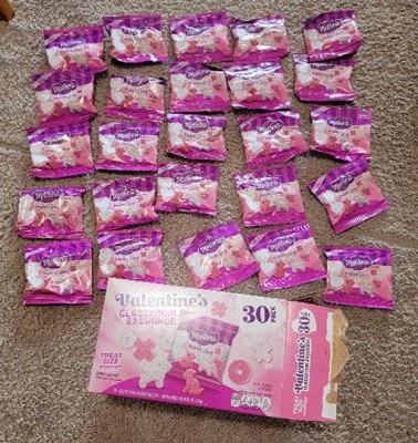 Many of the bags only had one tiny cookie in the bag. Others had maybe 3 cookies. The box was not even opened until last night to send to school today. I guess this company thinks it’s for kids so who cares? We do!!!! The parents who bought what they thought was a cute Valentines party snack for their children’s class party THATS WHO!!!! I will not buy anything else from the company. I hope the powers that be in that company are enjoying their temporary wealth. It won’t last long when you rip people off.