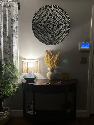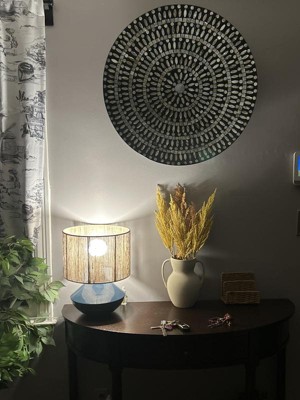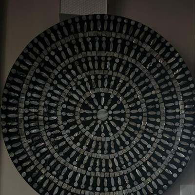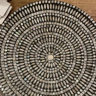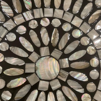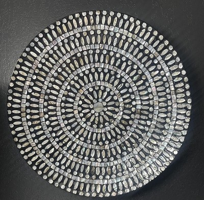 - It features a circular design with circular patterns from attached mother of pearl mussel shell materials