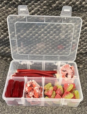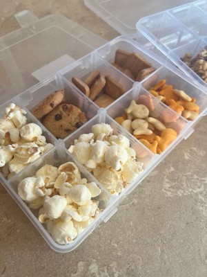 [This review was collected as part of a promotion.] This set came with two clear snack boxes and a roll of sticker labels. Each box has 8 sections. I like the small size. Can be used for snacks or small objects (beads, toys, jewelry). Plastic seems sturdy.