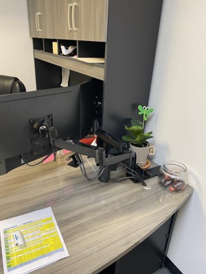 I looked and looked and looked for several weeks to find something that would work with how I wanted my setup. I kept coming back to mount-it because of the reviews and how well it was made. The only problem I had was my hutch was in the way and the arms were not long enough to wrap around inside the hutch if attached to the wall. I work in a manufacturing plant so I was able to talk to our drafter who made me an extension that sits on my desk and the part that is suppose to mount to the wall mounts to the sheet of metal. I can't be the only one who had this issue so below are some measurements along with a picture of how I set it up.