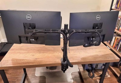 [This review was collected as part of a promotion.] We received the dual monitor desk mount to try a few weeks ago. The cable management is great, easy to adjust-tilt the monitors, and very stable.