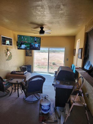 I certainly had my doubts about mounting a 150+ pound tv, but The Beast handles it no problem! It was great in the basement where changing the angle is a must in case people watching also want to be doing other activities without missing a moment of the action. We don’t leave the arms fully extended for significant amounts of time, but no issues at all in terms of pulling from the wall or sagging in the mount; no issues of any kind for that matter. Tv looks great in every seat, and all the cables are nice and managed behind the scenes.