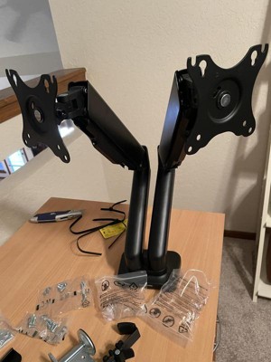 [This review was collected as part of a promotion.] My wife is a full time worker as well as a full time student in college right now,then we have our kids, the youngest is 3. When she has work to do, she has to try and find a place away from our toddler sometimes. This mount is a dual mount that works with laptops up to 17 inches and monitors up to 27 inches. It is adjustable. It can hold up to 13 pounds. It is easy to use and move almost anywhere. There is a clamp that can go on a desk or table, then you just screw the clamp until it is adjusted to a tight fit to whatever you have set it on whether a table or a desk. Then adjust as needed. Easy set up.