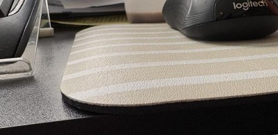 This is such a cute mouse pad and I love the light stripped pattern. It's a faux leather texture so it seems a bit sticky when moving my mouse over it, but it works well and seems to be pretty durable.