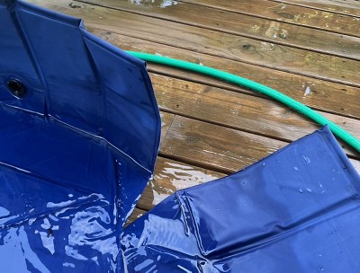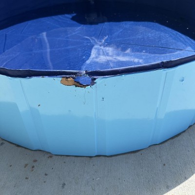 A 45lb dog ran into the side of the pool while inside and the whole thing split open. It lasted several uses, so under 2 months. We emptied it and dried it between each use. It’s a great size and very easy to store and set up. Sadly, the seems aren’t reliable and the bottom is too thin.