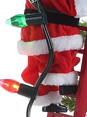 • Animated Santa Claus climbs up and down ladder continuously, LED light string in hand, decorating your tree