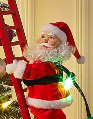 For two generations, Super Climbing Santa from Mr. Christmas has been decorating homes all over the world. A highly detailed Santa in a real fabric outfit climbs up and down a 43" red ladder, never tiring. The included arm and clamp allows you to attach Santa's ladder to any tree or lean him against a wall for easy display. Santa carries a string of LED lights to decorate with, and at the base of the light strand is Santa's toy bag, which plays 15 Christmas carols. Volume control allows you to enjoy with or without music, and the AC adapter operation lets Santa climb all day without interruption. Always stepping, never tiring, Super Climbing Santa will be a cherished part of your Holidays for years to come.