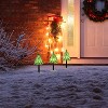 Enhance your outdoor holiday display this year with the 9 in. Set of 3 Lit Blow Mold Pathway Trees by Mr. Christmas. Our popular nostaligc trees have now been transformed into the perfect outdoor décor set your collection was needing. Each tree measures approximately 9 inches tall and 7 inches wide (without stake). These durable outdoor safe trees feature a classic nostalgic design reminiscent of holiday decorations from years past, adding a touch of vintage charm to your exterior outdoor décor. The set includes three trees tethered together with a 2-foot lead between each, allowing for easy placement along your pathway, driveway, garden or flower beds. Each tree is adorned with multi-colored bulbs that emit a festive glow, complemented by an illuminated star on top, creating a warm and inviting ambiance during the holiday season that will light the way for your guests as they enter your home. Designed with convenience in mind, the trees operate on 3xAA batteries (not included) with an on/off switch and a 6 hour timer function, making it effortless to control their illumination. Whether lining your driveway or enhancing your front yard with decorations, these pathway trees bring a nostalgic Christmas feel to your outdoor space, reminiscent of the cherished decorations of yesteryears. Removable stakes allow these retro trees to be used indoors as well - as a centerpiece, on a mantle, or on a bookshelf. Ideal for creating a festive atmosphere and spreading holiday cheer, the 9 in. Set of 3 Lit Blow Mold Pathway Trees by Mr. Christmas is a must-have addition to your outdoor holiday décor collection.