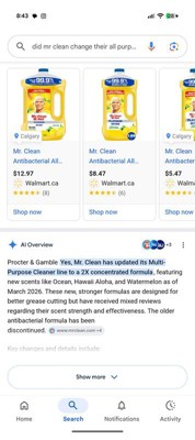 Hello Sami! Thank you for sharing your feedback about the Mr. Clean Surface Lemon Cleaner. We’re sorry to hear that you’re disappointed with the formula change and that the scent and cleaning performance didn’t meet your expectations. Your comments are important to us, and we will share them with our product team for consideration. If you’d like to discuss this further or need assistance, please feel free to contact us at (800) 867-2532.