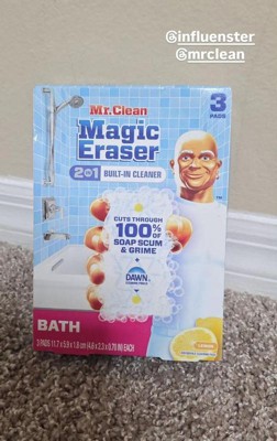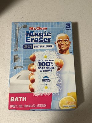 Mr. Clean Magic Eraser 2 in 1 has built-in cleaner and is tailor-made for all the messes your bathroom can throw at it. Just wet, squeeze, and erase bathroom messes with ease-even shaving cream, toothpaste, and makeup. This powerful cleaning sponge is a total bathroom cleaner. It cuts through soap scum on the first swipe, so you can spend less time scrubbing and more time tubbing. It combines Magic Eraser power with active foaming cleansers, making tough bathroom messes in your tub, sink, shower, bathroom floor, and more no big deal. And you'll love the fresh lemon scent it leaves behind. Add Mr. Clean Magic Eraser to your arsenal of cleaning supplies today!