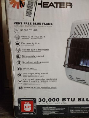 [This review was collected as part of a promotion.] Mr Heater 30000 BTU blue flame propane heater is an excellent heater. I have installed I'm my camp that is 420 square feet and it heats up the area fast. Installation was easy I did have to buy the appropriate adapters, which are explained in the instruction booklet I had the heater mounted and running within 30 minutes. The directions are clear and easy to follow. It has a battery operated ignition which works everytime with ease. My camp is very secluded so this heater was perfect. No electric required, no outdoor vent needed,it is safe and has a low o2 safety shut off. The unit looks great, and really heats the room well. The temp and flame are adjustable for your needs. A quality propane heater, that I feel safe using. I would highly reccomend.
