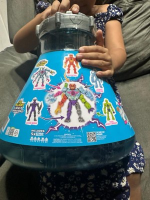 - Epic Reveal: Open the MrBeast Lab Mega Pack vessel and pull out a massive strip of 13 sealed foil bags. Open the bags to reveal different Hybrid parts to create millions of combinations.