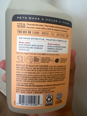 [This review was collected as part of a promotion.] This pet multi-surface cleaner smells wonderful. It contains probiotics to neutralize pet odors, not just cover them up. It doesn't contain bleach, parabens, or other ingredients that could harm your pet. It doesn't clean quite as well as traditional cleaners, but it's a good replacement since it's safe for pets. It's only safe for hard surfaces, unfortunately, not fabrics.