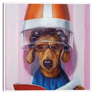 This whimsical framed canvas print features a stylish pup sitting under a bonnet dryer wearing a full set of hair curlers, getting her hair done. Printed on only top-quality canvas with first-rate technology, every brushstroke is distinctive and defined. Plus, with printing that covers the expanse of the canvas, framing is unnecessary and hanging your new artwork is a cinch