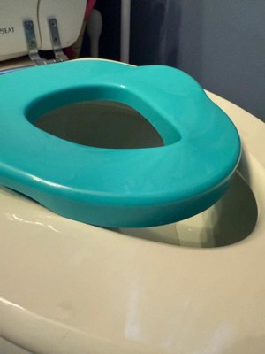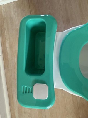 This is an adorable potty for Ms. Rachel fans. When you press the button you get multiple phrases with each push such as: "Time to wash your hands.", "It's Potty Time.", "This is your special potty. It's just your size.", "I'm happy on the potty. I'm happy on the potty.", toilet flushing sound, + more. The teal seat comes off to be use as an insert to go on top of the actual toilet, however I believe it is just meant for round toilet bowl seats. When I put it on our oval toilet seat, it only sits properly when put towards the back of the seat. If it moves forward too much then the seat falls into the toilet. This is why I deducted 1 star from this review.