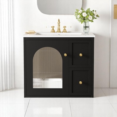 - Durable Ceramic Sink: The high-gloss ceramic sink is easy to clean and includes a built-in overflow and pre-drilled hole for a 4" centerset faucet (faucet not included).