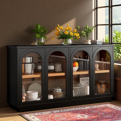 Mshliw Minimalist Buffet Cabinet with Glass Doors and Double Drawer, Kitchen Pantry, Modern Wooden Storage Sideboard for Dining Room, Living Room