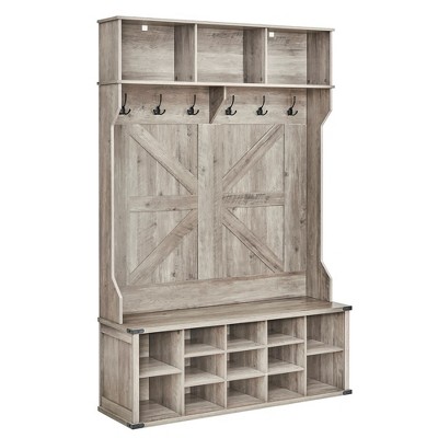 This multi-purpose hallway hall tree combines a removable cushioned bench, coat rack, storage shelves, and a creative DIY pegboard into one stylish entryway solution. Designed for modern homes, it helps organize shoes, coats, bags, and daily essentials while keeping your space neat, functional, and welcoming.