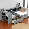 This twin size platform bed combines comfort, storage, and functionality in one design. Featuring an upholstered headboard, built-in shelves, drawers, and a charging station, it offers the perfect solution for modern living.