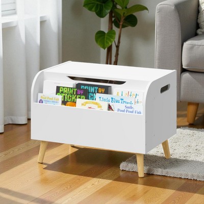 Mshliw Wooden Kids Toy Box with Wheels, Flip-Top Lid and Front Bookshelf, Toy Chest Bench with Safety Hinge for Playroom or Kids Room,Bookcase