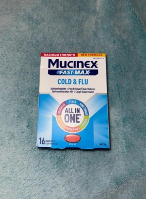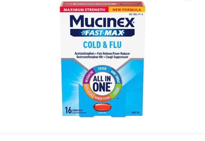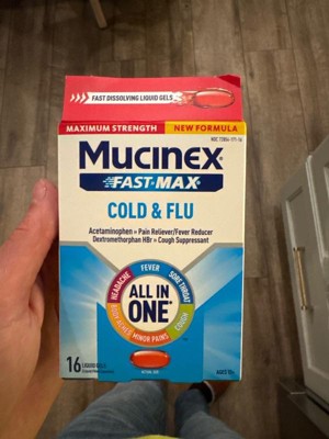 - COLD AND FLU MEDICINE: Mucinex Fast-Max Cold & Flu liquid gels provide powerful relief for headache, sore throat, minor pains, fever, cough and body aches