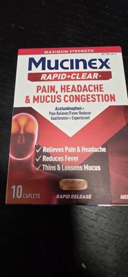 When cold and flu symptoms like body pain, headache, and thick mucus congestion strike, reach for Maximum Strength Mucinex Rapid Clear Pain, Headache, & Mucus Congestion caplets. This medicine starts working fast to help relieve cold and flu symptoms.