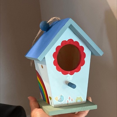 - Includes 1 blank wooden bird house, 2 wooden paint brushes, 6 mini paint pots