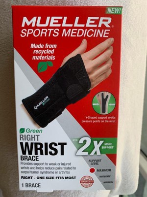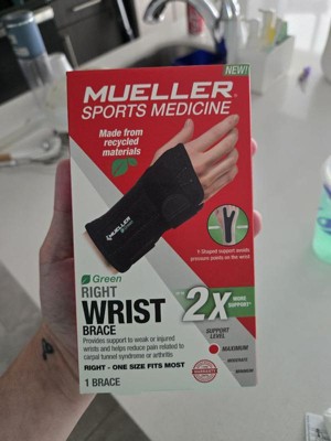 The Mueller Green Fitted Right Hand Wrist Brace is both lightweight and comfortable for all-day wear and night use. Designed to help relieve pain and swelling associated with Carpal Tunnel Syndrome. Supports weak or injured wrists while maintaining full range of movement in thumb and fingers. Made with extra comfortable padding for a very soft touch. Made with latex-free material.
