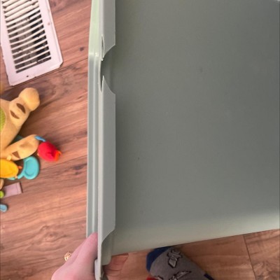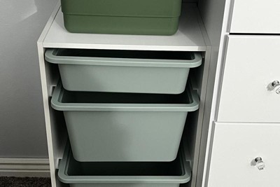 A: The bins are in a smoke green color, complementing the cream cabinet.
