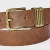 Add refined, casual style to your wardrobe with this Multi Keeper Belt from Universal Thread™. Featuring a smooth exterior with subtle textured detailing, this belt with a medium-width profile features a metal buckle closure for unique, fashionable appeal. It's fitted with belt loops and multiple holes for an adjustable, secure fit around your waist, and the solid color pairs well with both casual or dressy outfits.