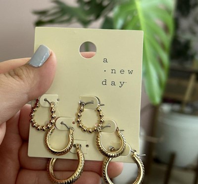 Multi Textured Hoop Trio Earring Set 3pc - A New Day™ Gold: Nickel-Free Metal, Hinge Closure, Lightweight Design
