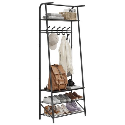 Multifunctional 5-Hook Hall Tree with Shoe Storage Bench, Real Wood and Metal Frame Coat Rack for Entryway, Hallway, Bathroom, 60cm wide, Black