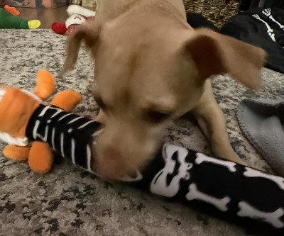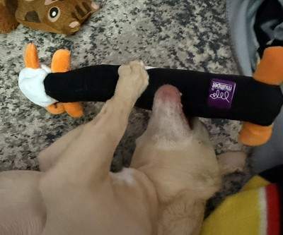 My little dog loves this! It is long and has a fun squeak to it which he loves. I love that that dog is in a costume. Too cute!