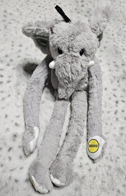 We got this Multipet Swingin Safari Elephant Plush Dog Toy for free but the opinions here are based on my own experiences. Its a dog toy and its 19 inches in length. Very lightweight and thin and cute. It has 2 squeak spots. The fur is sooo soft and cuddly. My kids even like playing with it. It has a tail too so lots of things to grab on to. It has no flaws that I see. Its cute and fun and easy to carry and seems to withstand good play with it. Its easy to wash by hand. It has a little loop on the head so you can hold it or hang it up as needed. Great for after hand washing to hang dry. Its got cute details such as the ears and the tusks and the white paws and its tail and trunk. Definitely recommend for any size dog.