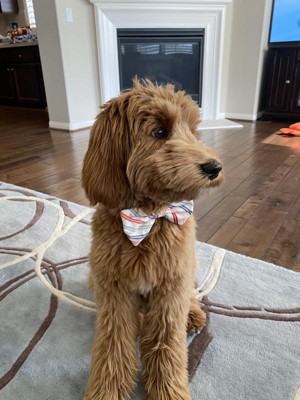 I love the neutral colors on this bow tie. I attached it onto the collar of my 6 month old puppy. It went on easily and he did not have any issues with wearing it. I think it is the perfect low effort stylish piece for a dog/cat especially if they don’t like wearing colors or accessories.
