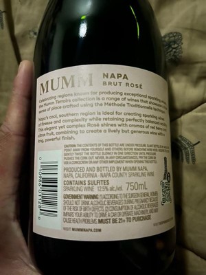 - INCLUDES: One 750 mL bottle of Mumm Napa Brut Rosé Sparkling Wine; 12.5% alcohol by volume; Enjoy and drink responsibly