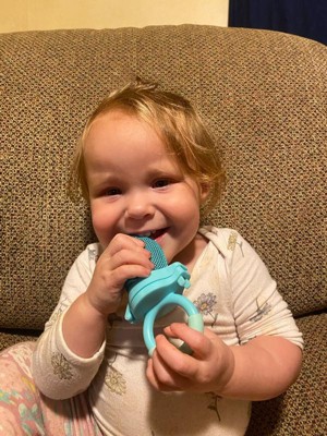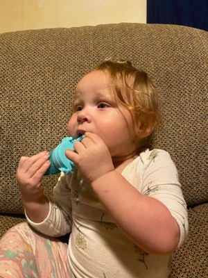 A: Good afternoon, with the Munchkin Fresh Food Feeder baby can chew, suck and taste the whole food goodness, with only small, digestible pieces coming through.