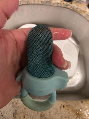 A: Hello, The Munchkin Fresh Food Feeder is first and foremost top rack dishwasher safe. As well, if you find that you are getting food stuck in the net the best way to remove it is with a soft bristled tooth brush. You can also soak the net in warm soapy water with a table spoon of vinegar to help dissolve and remove the pieces of food left/build up in the net.