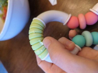 We love this teether! I like that it is made with silicone and beechwood, it's very natural and makes it feel safe for our baby. One of the unique things about this tea there is that it is twistable and movable for Arabic and movable for our baby to experiment with movement. 50 there not only does its functional job with the T but also profile provide cool textures and sound. We would recommend this to anyone I received this in exchange for my honest review.