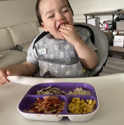 We love these lines of plates. The rubber grip on bottom keeps from sliding but the real great part is the nice tall sides. Makes it easier for little ones to load their silverware and decreases the mess of food falling over the edge in the process. With toddler twins that’s a total win for us. We’ve gone through a lot of different types of plates but the ones by munchkin are my favorite. I’ve phased out all my others and replaced with the munchkin flat plates and segmented ones.