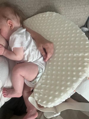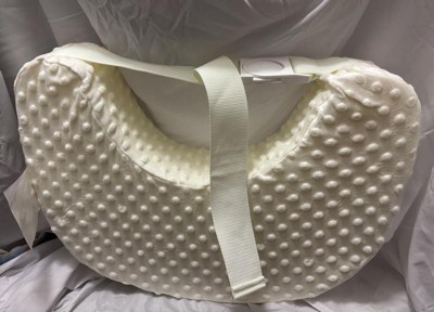 [This review was collected as part of a promotion.] I think I like the idea of the strap more than the strap itself. You wouldn’t be able to strap it on while holding a fussy baby but if you have time to set them down and buckle in, it works. Not sure how I feel about the angle of the pillow. My son likes it more as a little seat to prop up on my shoulder for burping instead of using it for feeding but that might be his personal preference. I like the texture of the cover and the color is a good neutral color. The packaging was nice and kept it clean, but incredibly frustrating to open for the first time. The plastic strings were really short and difficult to cut.