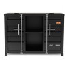 Add functionality and a masculine touch to a space with this industrial console table. Built of a sturdy steel metal construction, this industrial console table is made to last, and can double as a dining room buffet table and even a home office storage space. Inside are 6-shelves to accommodate anything from paperwork and files to coffee cups and dishes for extra guests.