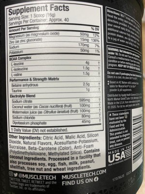 bcaa complex: l-leucine, l-isoleucine, l-valine. performance & strength matrix: betaine anhydrous, taurine. electrolyte blend: sodium citrate, coconut water (as cocos nucifera) (fruit), watermelon juice (as citrullus lanatus) (fruit), sodium chloride, dipotassium phosphate. other ingredients: citric acid, malic acid, silicon dioxide, natural flavors, acesulfame-potassium, sucralose, beta-carotene (color), anti-foam (polydimethylsiloxane, methylated silica).