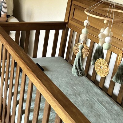 Made from 100% cotton, our extra soft, mini crib sheet features a breathable muslin fabric that keeps baby comfortable and cuddly all night long. The sheet is designed with full elastic edges for easy removal on all mini crib-sized mattresses. It’s pre-washed for softness and maintains a perfect fit after every wash.