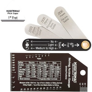 The Truss Rod Gauge & String Action Gauge Bundle contains Music Nomad's two most popular precision gauges. Measuring neck relief and string action height are the two most common tasks performed to improve guitar or bass playability and sound. The first step is to use Music Nomad's Precision Truss Rod Gauge which comes equipped with the three most common relief measurements (.006", .008", .010"). Instructions printed right on the handle make it extremely easy to dial in neck relief. The second step is Music Nomad’s Precision String Action Gauge that comes with accurate measurements that are easy to read with the black finish contrasted with deep-etched white markings. Measurements are in inches, metric and 64ths to customize to preference. A convenient chart on proper height by instrument type takes out the guesswork. Both gauges are designed for all electric, acoustic, classical and bass guitars.