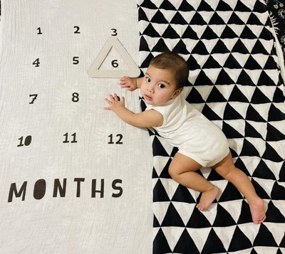 The Black and White Triangle Muslin Blankets with Felt Frame Set from cloud island™ does double duty for versatile use. One blanket has the numbers one through 12 and a space to place baby. Set the triangle felt frame on the appropriate month and snap a picture to document baby's growth. When you're not taking pictures of your little cutie, you can wrap them up in these soft, cotton muslin blankets for cuddles or swaddle them up for nap time in sweet style.
