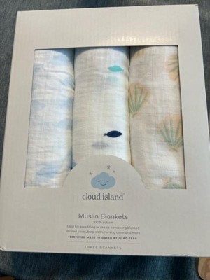 This 3-Pack of Muslin Swaddle Blankets from cloud island™ is perfect for keeping your baby warm and cozy. The pack includes three white square blankets, one with light blue fish prints, one with peach seashell prints and one with undersea print, to add a touch of ocean-inspired style to their snuggle time. Made from 100% cotton, these muslin swaddle blankets feel soft against their skin and offer cozy comfort, and they're machine washable to make cleaning and maintenance a breeze. Great for swaddling that leads to deep sleep, these versatile blankets can also be used as stroller covers, burp cloths and more.