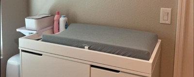 This changing pad cover is so soft! I’m using it on the thin pad that came with our changing table. I tucked all the excess fabric underneath and it has stayed put even with my wiggly 20 month old. It washes well and the color is a beautiful muted blue.