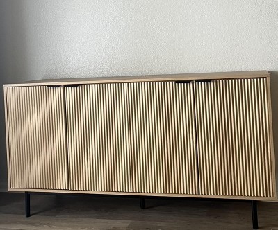 58" Fluted Storage Sideboard - This versatile buffet cabinet blends natural tones with functional design, featuring 4 compartments with adjustable shelves for kitchen essentials or a coffee station setup. The scratch-resistant surface and steel-reinforced legs (150lb capacity) ensure durability in high-traffic areas. Integrated wire management and a 33" open shelf optimize space for appliances. Quick 18-minute, tool-free assembly with pre-drilled joints. Perfect as a stylish storage solution for dining rooms or small apartments.